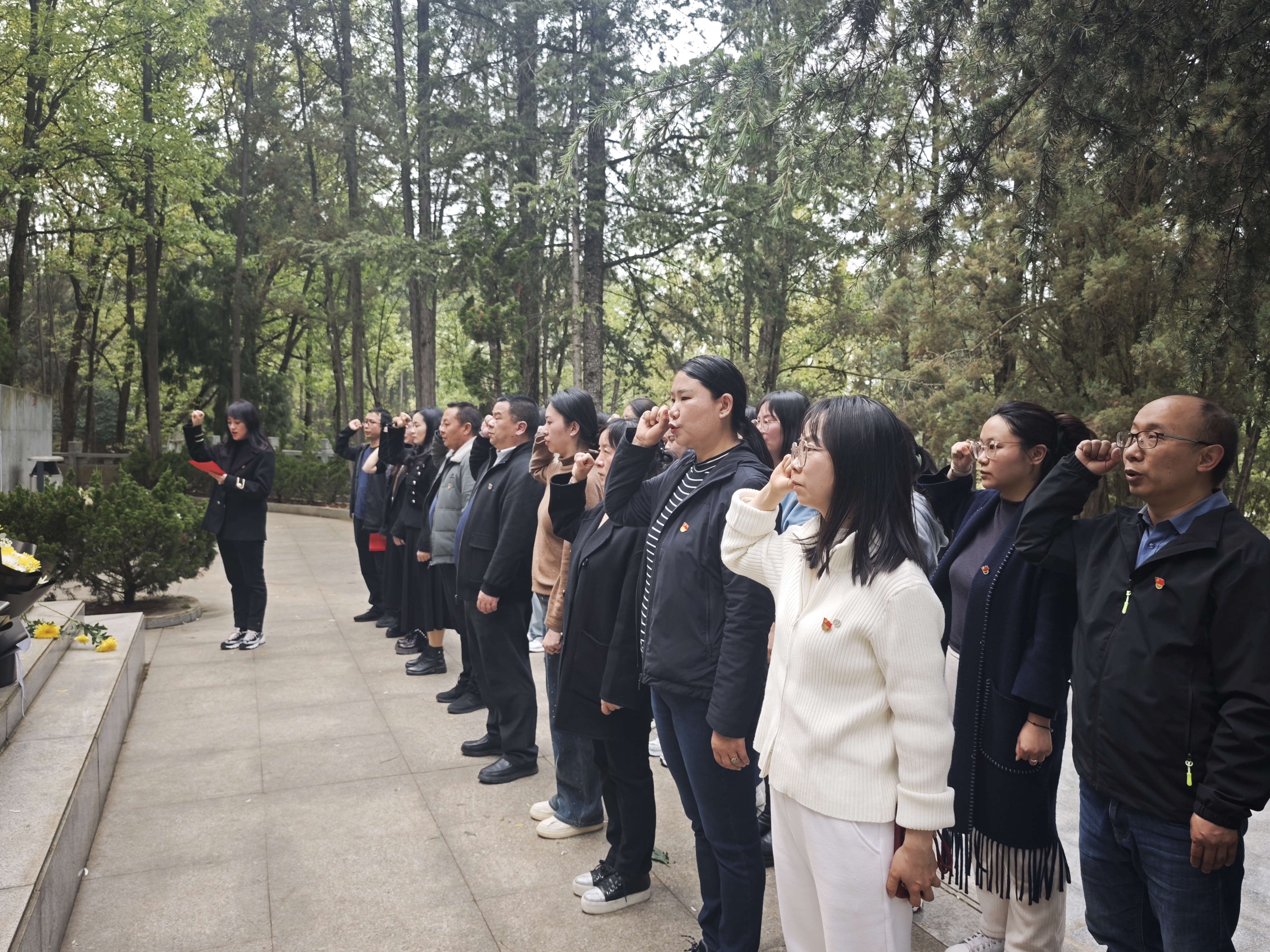 在庄严肃穆的烈士纪念碑前,全体人员整齐列队,静默肃立,默哀鞠躬,寄托哀思。党员代表敬献花篮,全体人员依次排队,敬献菊花,表达对革命先烈的深切缅怀和崇高敬意。随后,党总支副书记武星君带领全体党员重温入党誓词。