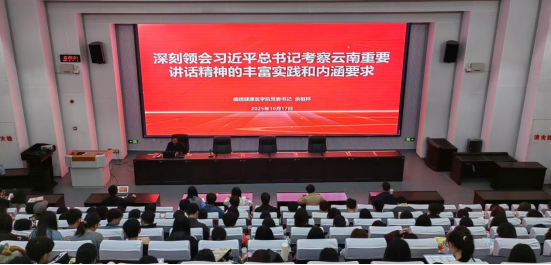 10月17日,学校党委书记余祖林以《深刻领会习近平总书记考察云南重要讲话精神的丰富实践和内涵要求》为题,为2024级口腔医学班、口腔医学技术班、康复治疗技术班的同学讲授了一堂精彩生动的思政课。余祖林紧扣习近平总书记三次考察云南重要讲话精神,明确学校作为云南医学教育重要组成部分的定位,提出要坚持立德树人,构建“大思政课”育人体系;要深化产教融合,服务云南生物医药、大健康产业需求;要强化社会服务,为基层培养“下得去、留得住、用得上”的医学人才。他提出,教师要弘扬教育家精神,做学生为学、为事、为人的示范;青年学子要坚定理想信念、练就过硬本领、投身社会实践、勇于创新创造,鼓励学生将个人成长与云南发展、国家战略结合,通过参与健康义诊、医学科普等实践活动锤炼技能,拥抱新医科变革,为云南医疗卫生事业和“健康中国”建设贡献青春力量。
