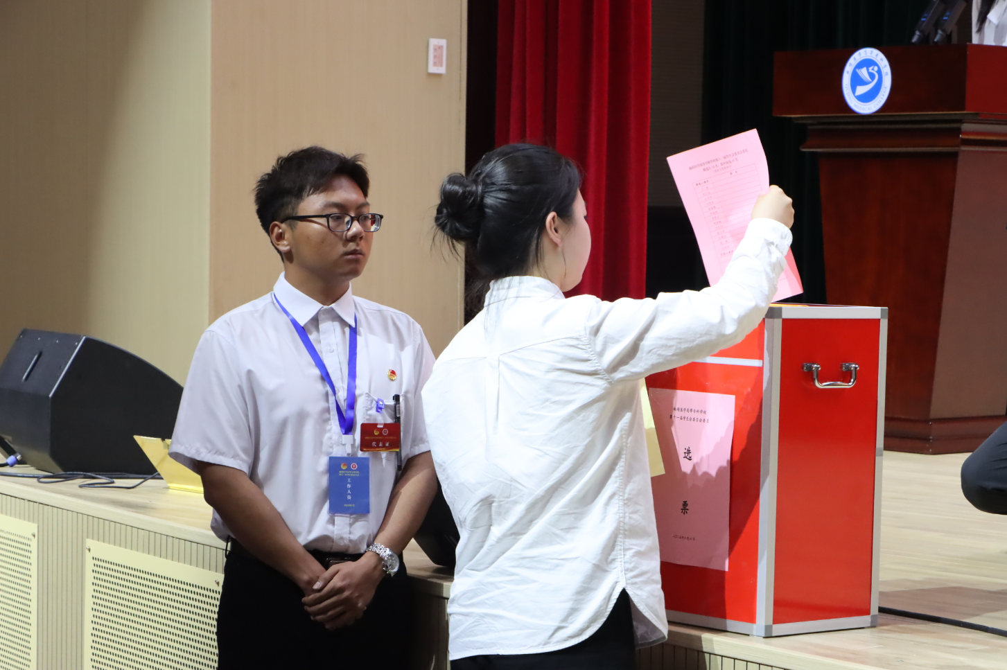 七、大会设2个票箱。投票前,由监票人当众检验票箱并加封。投票时,先由总监票人、监票人、总计票人、计票人投票,接着主席团成员投票,然后代表按投票线路,依次到指定的票箱投票。